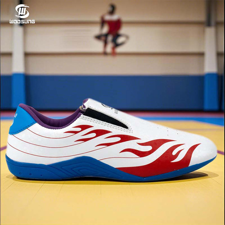 De Taekwondo-sportschoenen van Woosung zijn speciaal ontworpen voor de veeleisende eisen van taekwondo-beoefenaars. Deze schoenen hebben een strak wit bovenwerk versierd met levendige rode en blauwe vlamafbeeldingen en zien er niet alleen indrukwekkend uit, maar geven ook een boost aan zelfvertrouwen op de mat. Het merk Woosung staat synoniem voor kwaliteit en innovatie, en deze schoenen vormen hierop geen uitzondering.